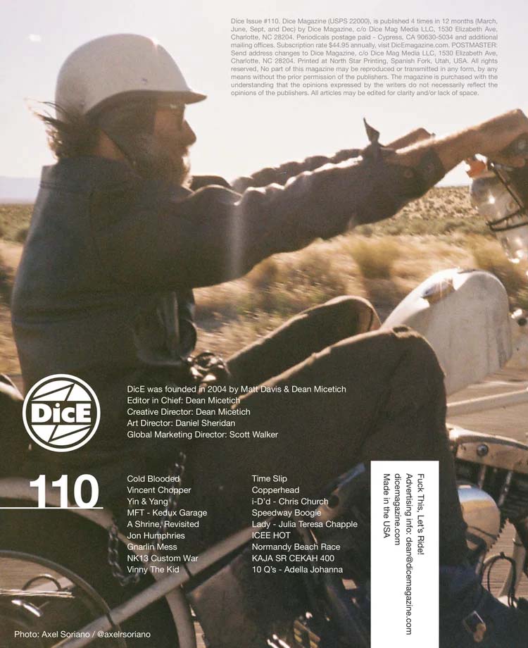 I was just telling my mate Tokyo Terry that they don’t make em like they used to but that simply ain’t the case when it comes to Issue 110 of DicE Magazine. It hits hard like a micro scooter in the shin with 132 pages, weighing in at 1.1 lbs and featuring the coolest cats across town. The champagne of motorcycle magazines. Text and photos by DicE magazine |