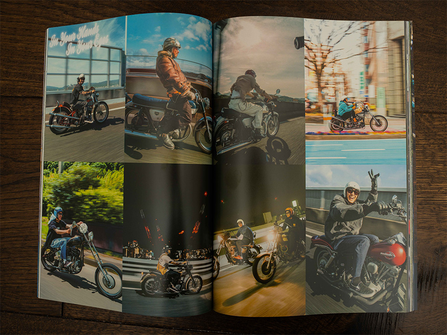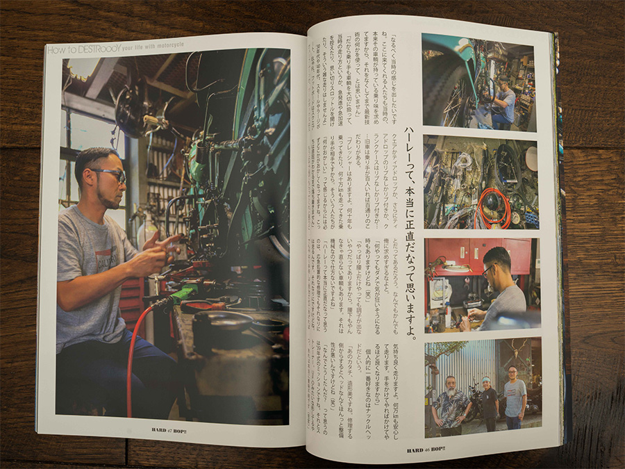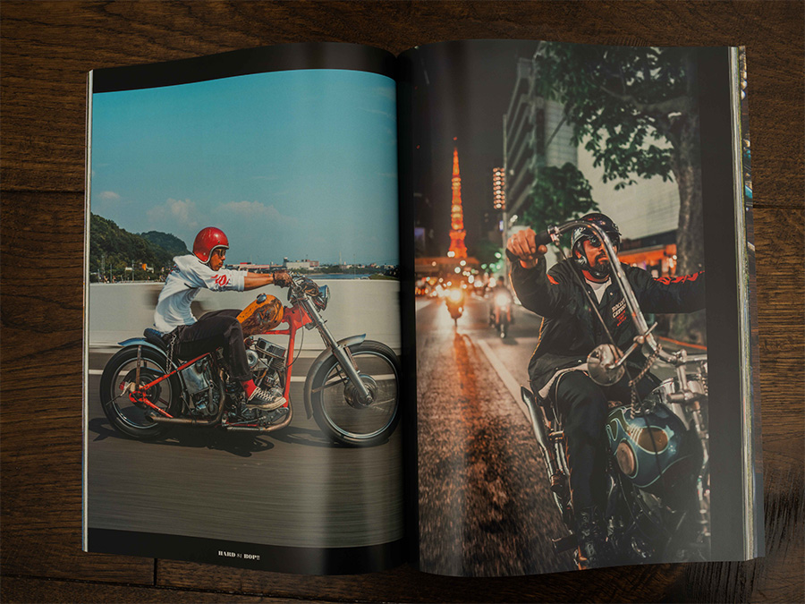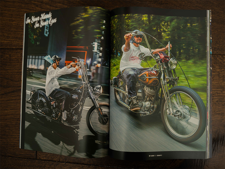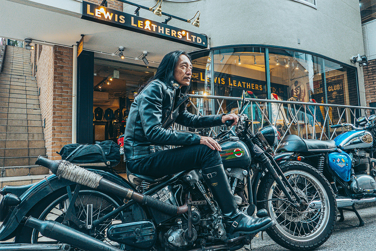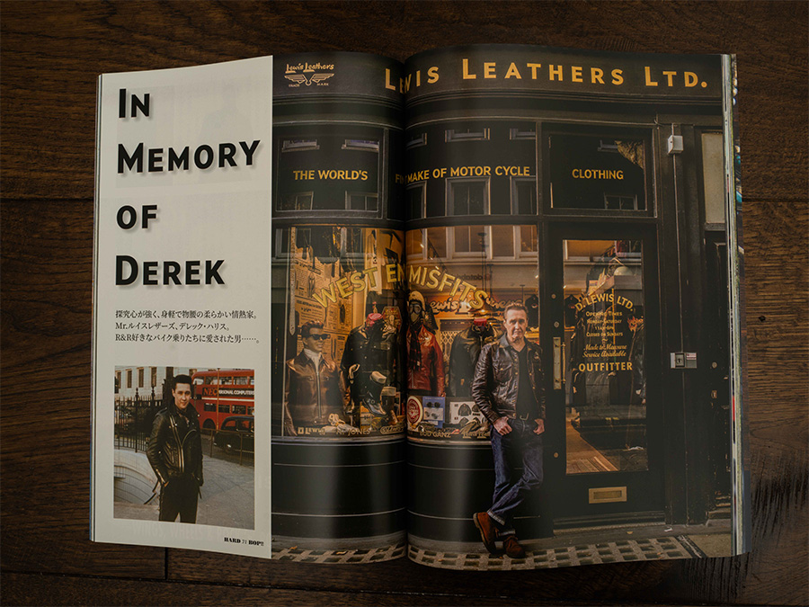 A snapshot of Tokyo Style! Founded by Minoru Uemura, the latest edition of Hard Bop, the magazine with a wide-open throttle for true pre-EVO era Harley-Davidson enthusiasts, features a 6 page tribute to the late proprietor of Lewis Leathers, Mr Derek Harris and then a further 6 pages on the Wings, Wheels and Rock'n'Roll music festival, inspired by the vision of Mr Harris and staged in Tokyo earlier this year. Pictured here by Mrs Saaya Harris Nohara outside the Lewis Leathers shop in Ura-Harajuku, Uemura san sits astride his customised Knucklehead, wearing a Lightning Jacket No. 391 and Motorway Boots No. 191. Thank you Mr Uemura: a real Lewis Leathers man!