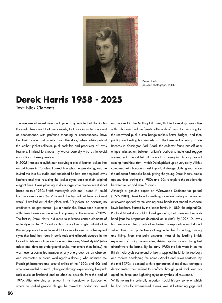 Dear Readers It’s been a mixed year for Men’s File and all lovers of style as we lost one of our friends and colleagues who was with us from the start, not as an official part of the magazine, but as a supporter and adviser. Derek Harris was proprietor of Lewis Leathers for over 20 years, during which he influenced, and even partly instigated, many factions within the heritage style and revival scene with his policy of ‘reissuing’ the best of Lewis Leathers from the past 100 years – a unique approach that contradicts fashion’s obsession with the new and the disposable. Derek’s passing was unexpected and a real blow to us and it’s for this reason we dedicate this issue to him and his work while simultaneously supporting his wife and business partner Saaya Harris Nohara and looking towards a bright future for the brand, that Men’s File will continue to support and report on. We live in an epoch in which self-congratulation is encouraged, but up until now it’s not something this publication has embraced, nonetheless, it’s fair to say that Men’s File is unusual in many aspects and in particular the age range of its readers and contributors. In our thirty third issue, we focus on extraordinary individuals like London-based fashion design students Si ‘Kenny’ Chen and Rebeca Illie, whose ages, when combined, are less than half of that of your star guest Mike Minchinton, shot at the Minchinton Ranch by Monti Smith. No matter who you are, where you are from or what your age, if you contribute significantly to a style scene that comes within our remit, we might feature you on our pages. Although I would add that true ‘stylists’ are rare birds indeed. Elevating the recreation of historical events to unparalleled levels, Simon and Jamie Delaney and friends, who sometimes call themselves Spirit of Britain, are once again in action from their Norfolk workshop / HQ with an impressive collection of Triumphs – from untouched barn-finds to pristine restorations (all done in-house). Finally, we want to thank all the contributors and advertisers that keep Men’s File alive, without you, we couldn’t go on with our labour of love. Our original goal, of finding hidden or underground manifestations of male style that usually reference the mid-20th century and push back against the mainstream, in still ongoing. All the time we have your support, we will bring you new stories from around the globe. Remember, Men’s File is an AI free zone.